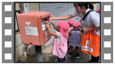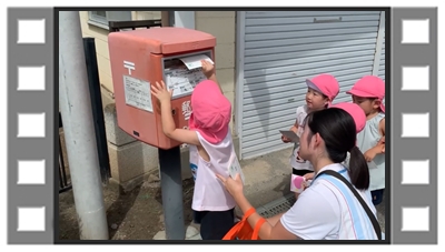 みんなで散歩に出かけ、ポストにハガキを投函しました。
